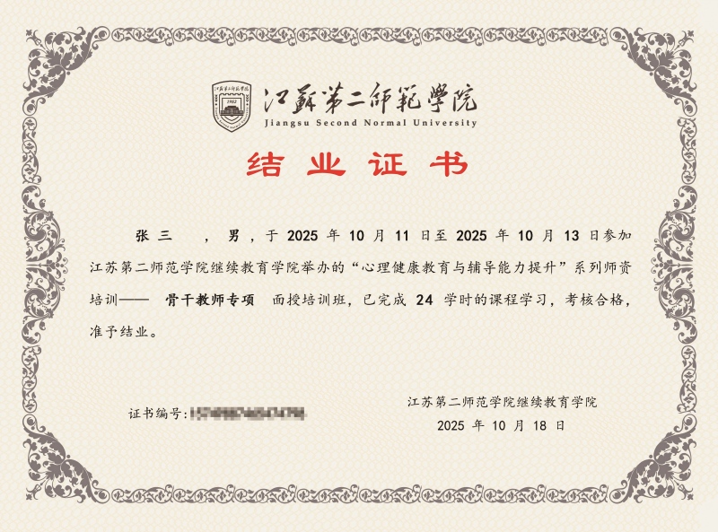 5.考核方式:在线结业考试加实践考核。学员完成所有网络课程学习后进行在线结业考试,每人最多可以考3次,成绩合格的,学习平台自动生成电子版《合格证书》;学员参加集中面授培训结束后一个月内,撰写并提交《个体心理辅导案例分析报告》和《心理健康教育教学案例》各一份进行实践考核,考核合格的由江苏第二师范学院继续教育学院颁发《结业证书》,不合格的可免费补考一次。